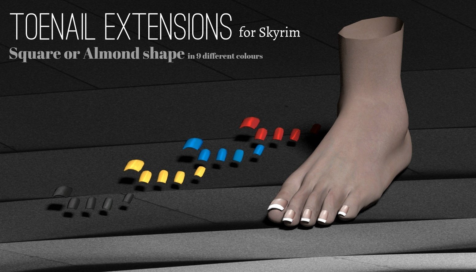 Добавляет экипированные ногти на пальцах ног от Skyrim Legendary Edition. Мод был перенесен из UUNP в CBBE. Особенности два типа ногтей: квадратный и миндальный. Поддержите новые ножки CBBE SE и сделайте их более телесными для более женственных ног. Использует слот для снаряжения 48 и изготовлен из кузнеце, в разделе "Стеклянные доспехи". Может быть улучшено.