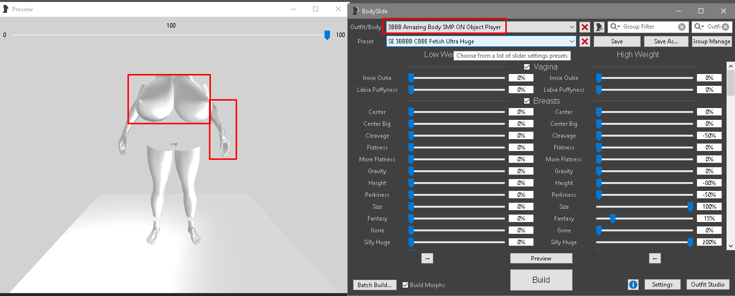 Так... похоже, всё-таки LabiaVariants 3BBB  глючит. Без неё и с персетом cbbe slim грудь вернула форму в бодислайде.
