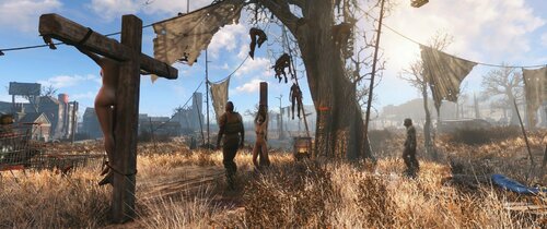 - в лагерях/логовах рейдеров и супермутантов вы найдете пленных поселенцев в разных состояниях: распятыми, на коленях и т.д.