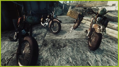 В этом моде вы сможете найти четыре ремонтируемых байка в столице Пустоши и два в Пойнт-Лукаут. Каждое представляет собой визуальную вариацию двух разных типов моделей байков. Всего в игре можно приобрести и модифицировать шесть мотоциклов. Соберите их все!