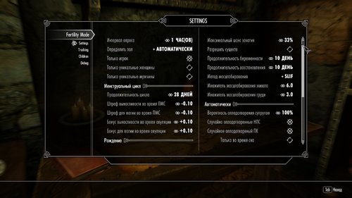 Когда включен режим фертильности, женщины встречающиеся в Скайриме будут автоматически отслеживаться. Осеменение может быть достигнуто автоматически с помощью опции MCM, а так же с помощью дополнительных модов, таких как Flower Girls или SexLab. В меню MCM в разделе отладки есть функции позволяющие управлять этим вручную. Кроме того, когда вы состоите в браке, сон с вашим супругом также приведет к оплодотворению одного или другого соответственно. Так же в MCM доступны заклинания отладки / читерства.
