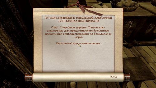 Топальская закусочная (таверна) финансируется Советом старейшин и проживание бесплатное. Но на самом деле это южный форпост Клинков, которые следят за путешественниками, проходящие через эту таверну. В ней есть одна двуспальная кровать, а если вы присоединились к Клинкам, то получите доступ в подвал, где есть односпальная кровать, ящики и безопасные контейнеры.