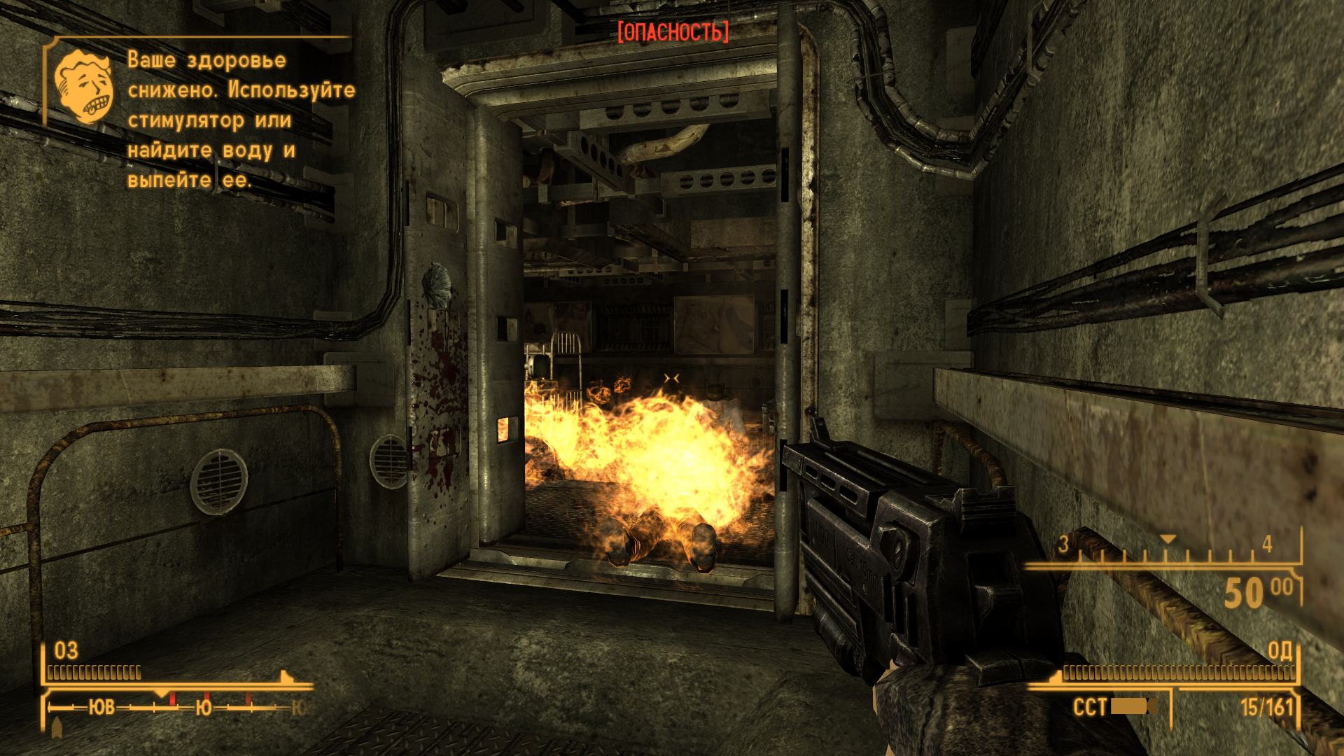 Да в этом то и дело, что у меня банальная варминт винтовка, а противник подрывники в подвале парашютной школы. Кроме того, при защите Гудспрингса Джо также почему то загорелся и лишился оружия.