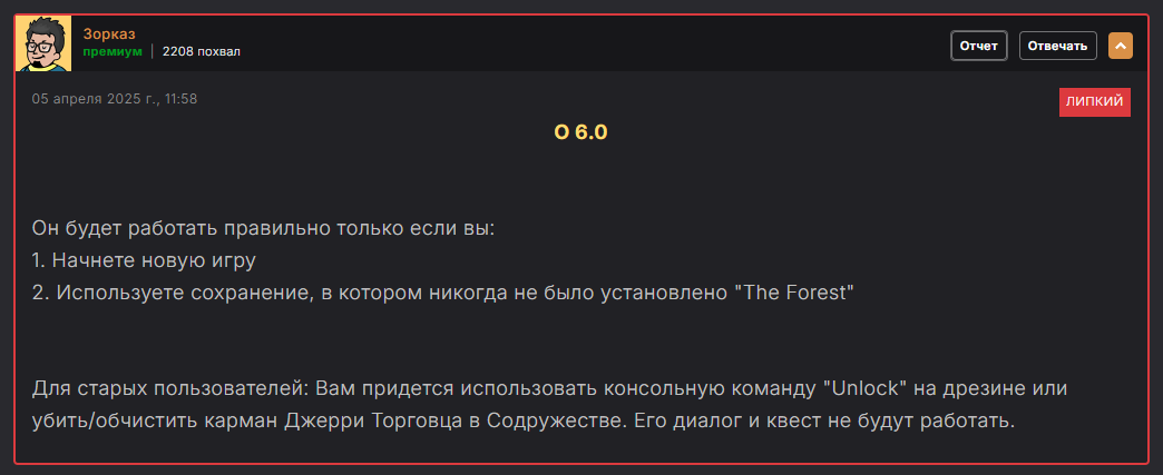 Я его и там прочел. А что поменялось-то?! Сообщение для обновляющихся, а я мод "с нуля" в прохождении ставил. У меня условия соблюдены. Ты невнимательно мой вопрос прочел. Ошибки только те, что я описал, в остальном квест работает. Ты сам этот квест проходил? Губы двигались, диалог скипнуть можно было и закончить квест убеждением не получая по башке?