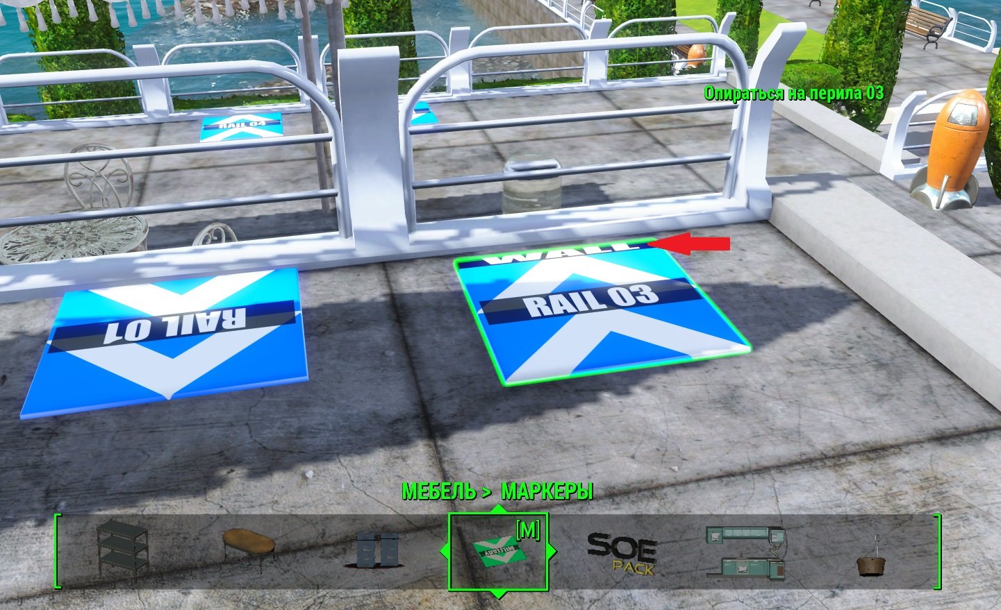 Есть мод Маркеры анимации для NPC | Invisible Furniture в котором есть маркеры и для перил тоже. Маркеры видны только в режиме Мастерской