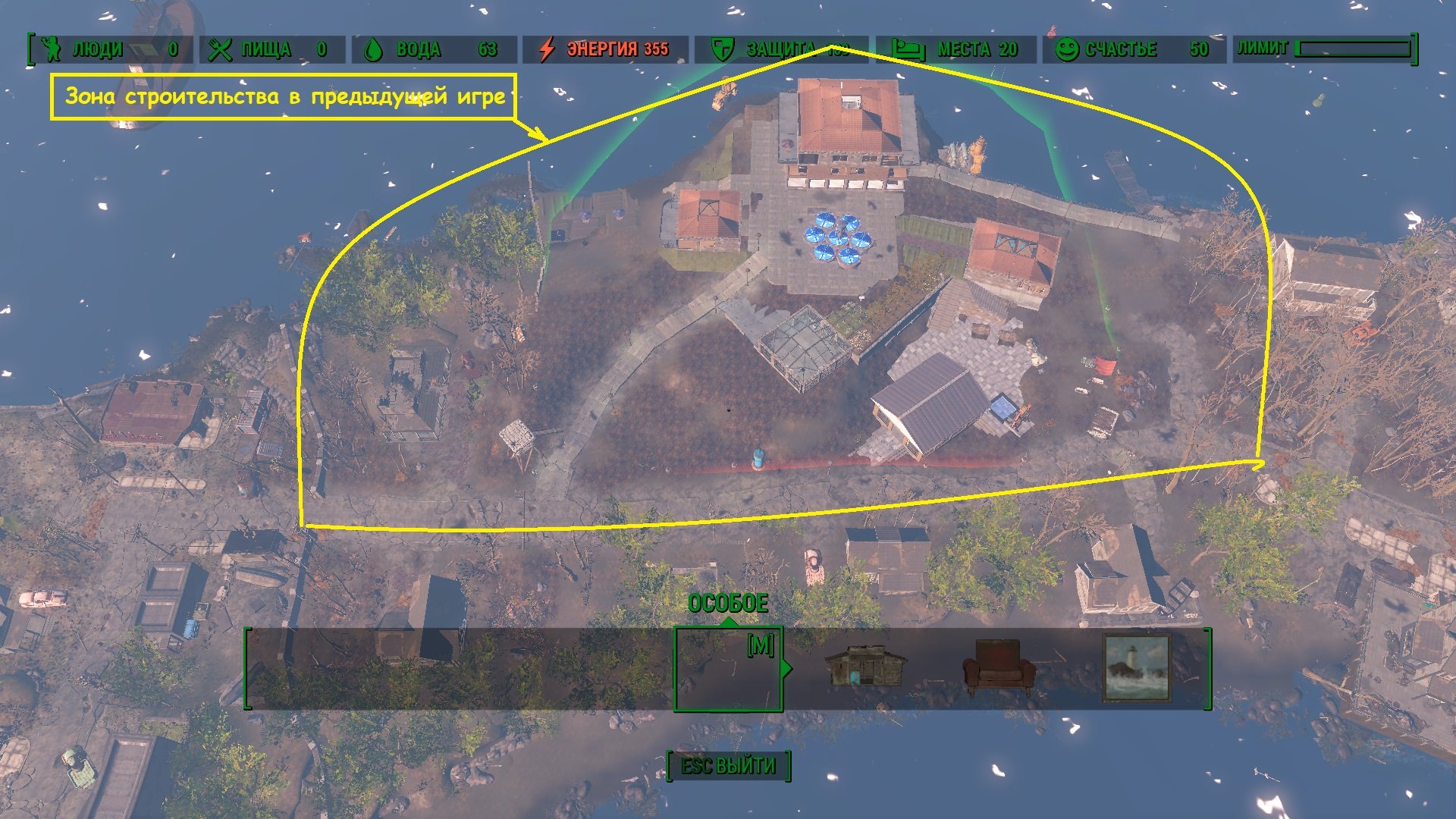 Worlok 249 Опубликовано 20 августа, 2024 (изменено) 26 минут назад, olgasmor сказал: Но некоторые модовые поселения надо ставить ниже скрапа. Это - Модовые возможно, но я такими не пользуюсь. "Пару прохождений тому назад" ставил большой готовый мод на поселение Круппов .Там у автора был вообще весь полуостров задействован. И сам Дом был роскошно отреставрирован. Но неписи плохо в нем двигались, собирались толпой и прочие несуразности. Так что я только свои теперь строю., и загоняю их в чертежи,чтоб в следующий раз не тратить недели на стройку... Мод "All in one. V6.1" обещает вот такие угодья, а на деле даже чуть меньше, чем в том,что у вас стоит... Изменено 20 августа, 2024 пользователем Worlok Поделиться сообщением Ссылка на сообщение
