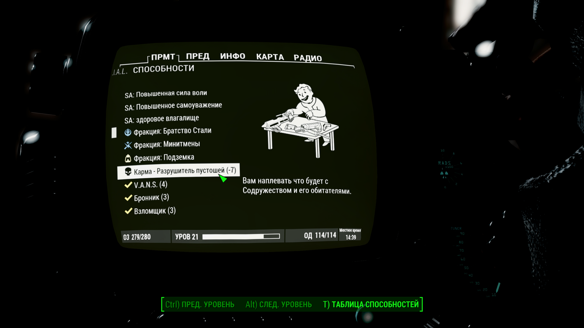 в основном играю по Альтернативному сюжету , ну там квесты от Мерфи и прочее-прочее тому подобное, а от Минитменов (по возможному минимуму)  построил только 4-5 поселений, и конечно-же, наладил оборону, вода, еда и т.д всё на самом высоком уровне, хотя счастье периодически падает, как-то разными способами поднимаю его наверх, вытащил из плена 2-3 заложника, несколько раз успешно бросался на защиту. Удивлению моему не было предела когда открыв способности вдруг увидел - Карма ( -7 ) . За Что ... !? Получается если играешь не по ванили, не берёшь квесты у Престона на развитие содружества, то тебе за это в карму срут что-ли, или как ?