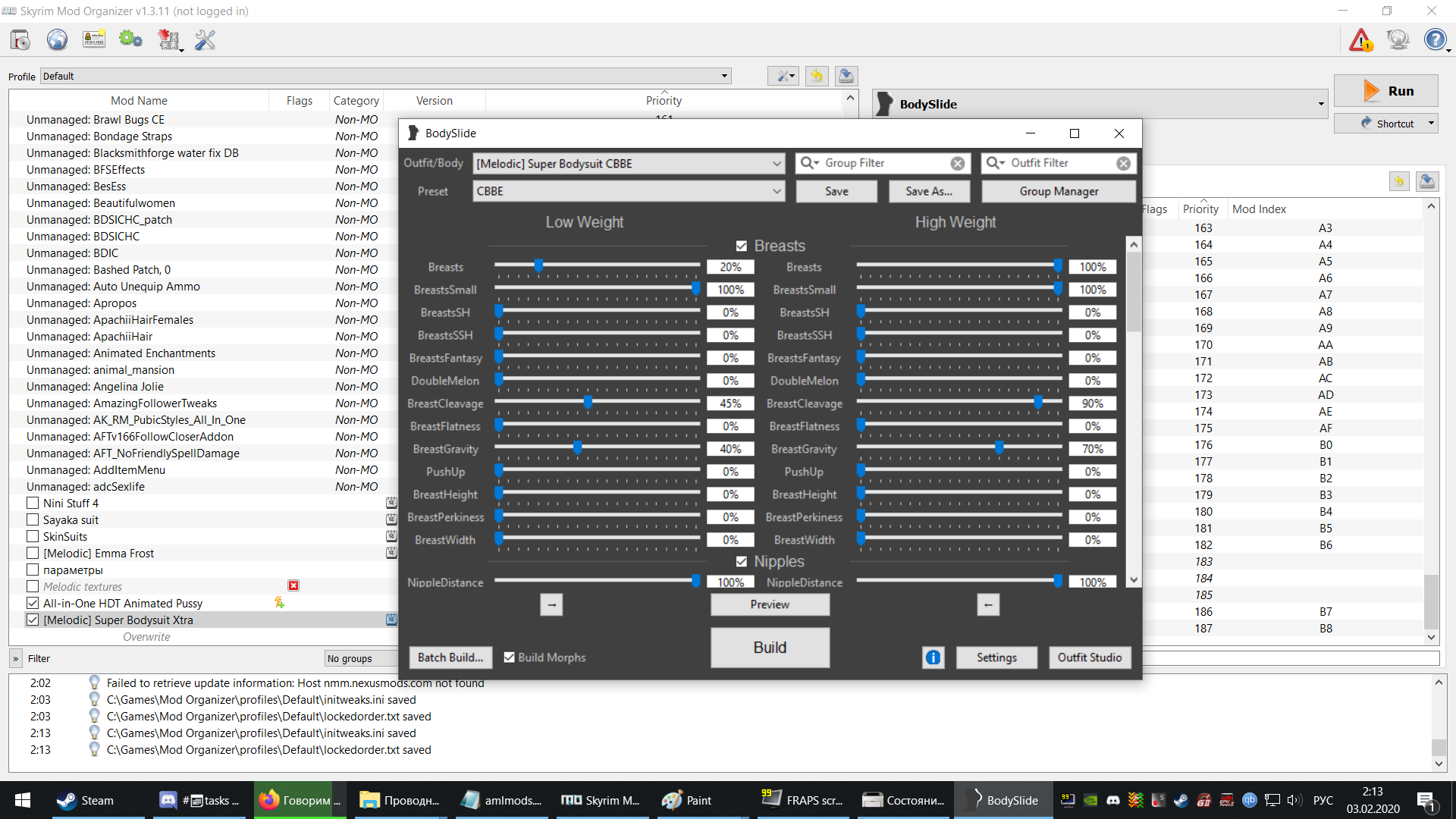 PapaGeorge 2 832 Опубликовано 2 февраля, 2020 (изменено) @destroship 1) Этот предмет, по своему названию, подразумевает волосы, поэтому без волос не могу никак. 2) У меня последняя сборка с предустановленным телом Торна (CBBE TBBP) 3) С помощью Batch Build можно подгонять не все (ПКМ на всем списке и можно снять все галки, а поставить только нужные), но если не много, то можно и Build обойтись. 4) Я с МО не работаю, поэтому запускаю BodySlide x64.exe 5) От первого лица не играю, но может этот шмот не поддерживает вид от первого лица... но это не точно. 6) У МО свои заморочки, поэтому ничего сказать не могу. И самое главное: какая раса установлена? У меня ванильный эльф. С альтернативной кина не будет. Изменено 2 февраля, 2020 пользователем PapaGeorge Поделиться сообщением Ссылка на сообщение