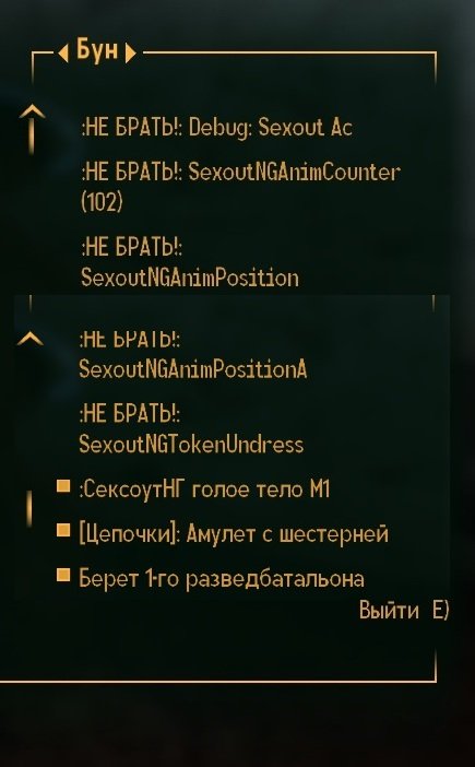 В этой сборке диалоги на секс находятся в моде SexoutSex.esp и SexoutStraponSex.esp. Их можно переустановить не потеряв статы и сексперки