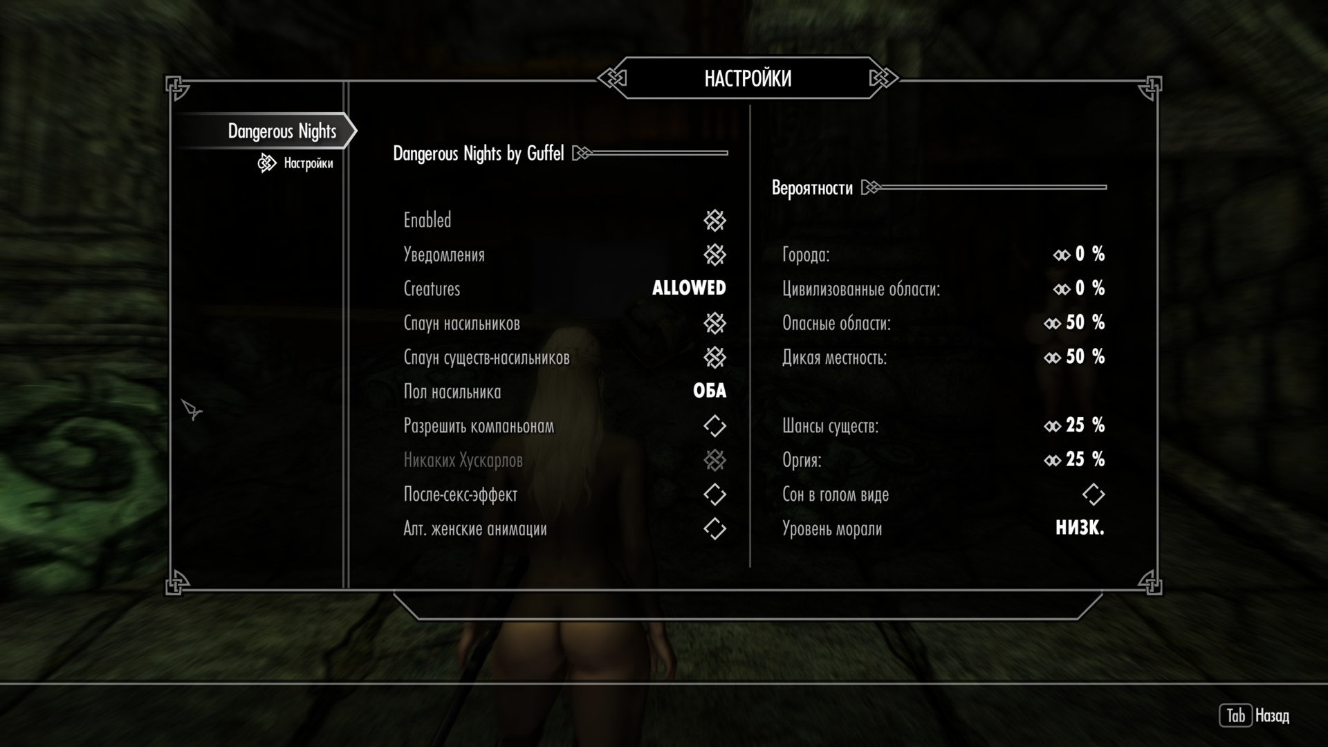 Если вам надоело приставание НПС с фразой "мне нравится твое тело, давай развлечемся" его можно отключить в настройках мода Naked Dungeons.