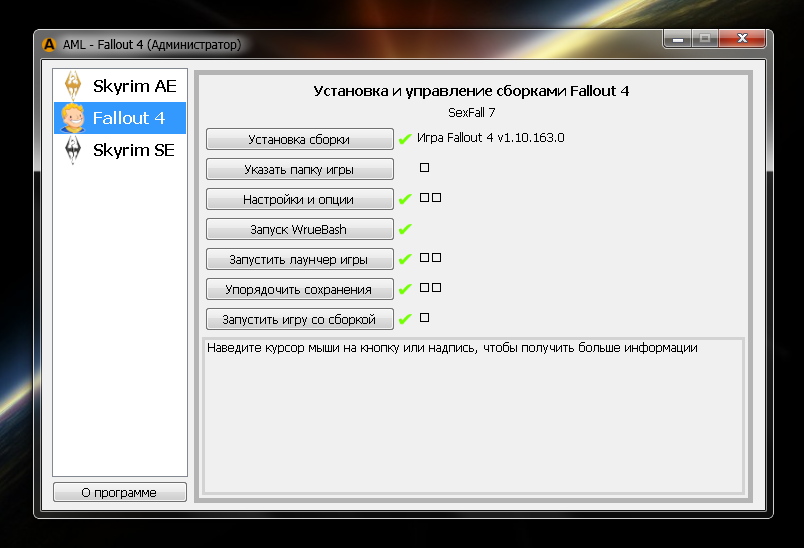 Требуемая версия игры: строго - Fallout 4 - 1.10.163.0 с 6 или 7 DLC. Другие версии несовместимы!