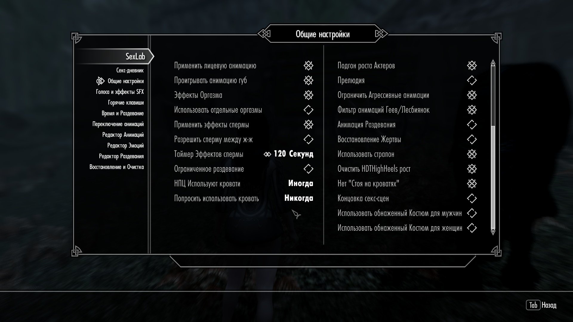 SexLab, кажется вторая вкладка. Листать до конца вниз! Эти опции в самом низу.