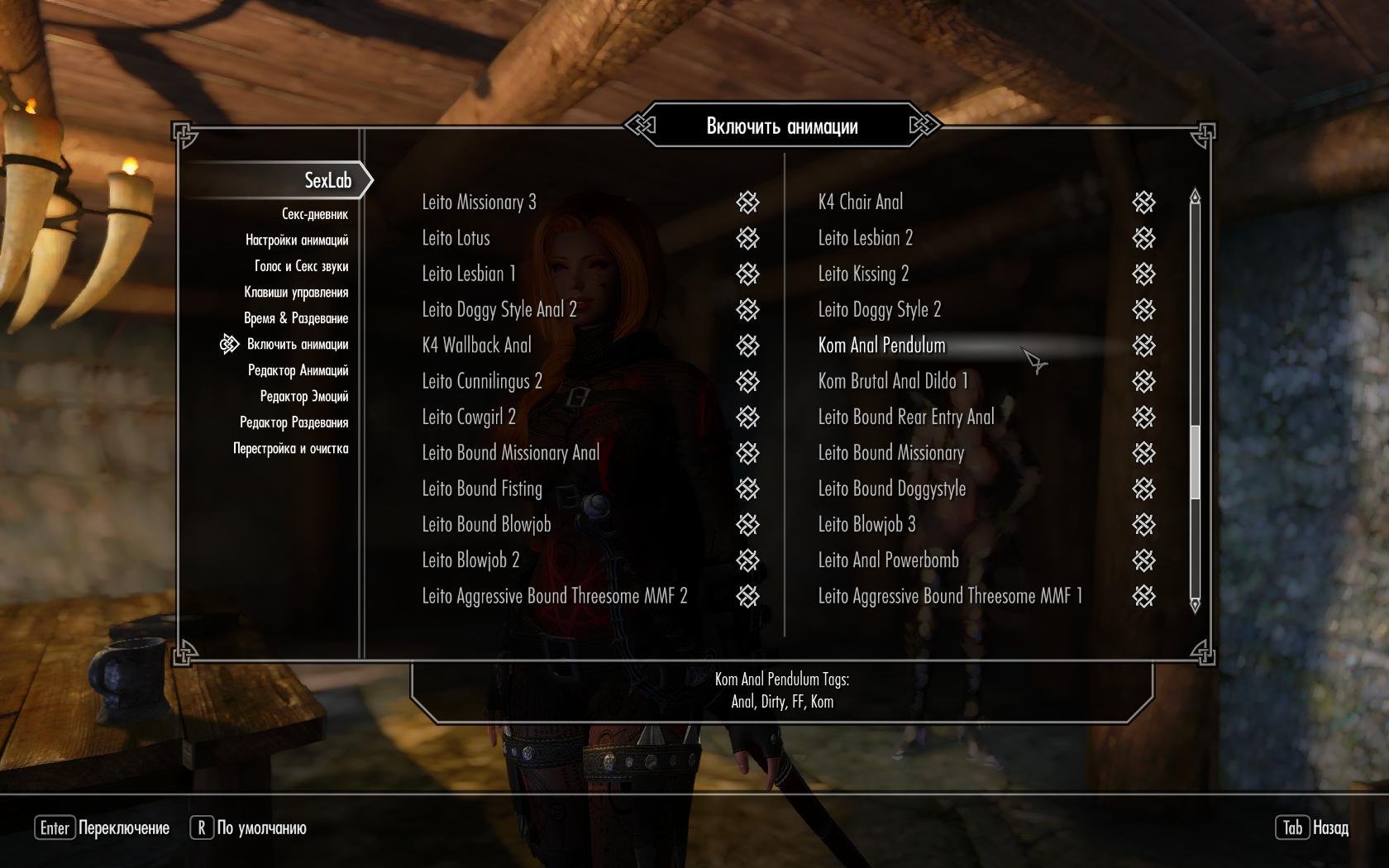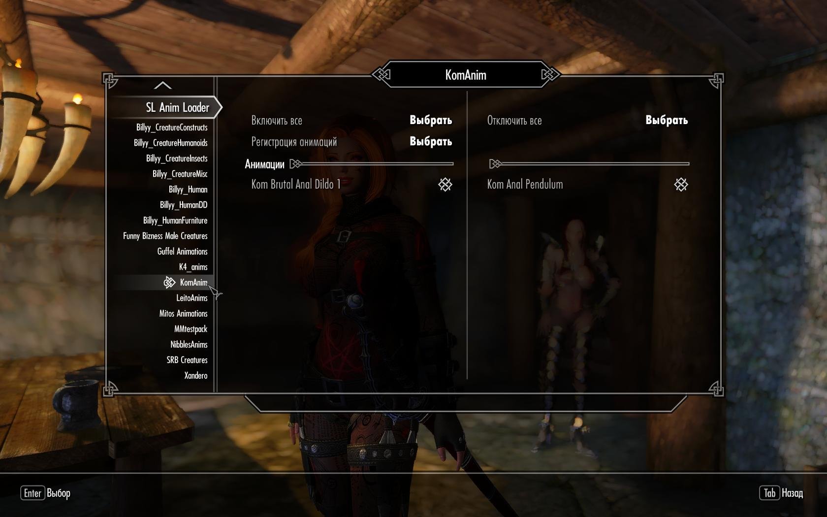 Прости, что дёргаю тебя в воскресенье, но башка вся поломана и я опять на грани психического срыва. Никак не удаётся внедрить в SexLab "SLAL KomAnim2.0 Public". То-есть через "SLAnimLoader-1.5" я этот пак загрузил и зарегистрировал, а вот в в SexLab он не появляется. Я и регистрацию снимал в в SexLab-е с последующей перерегистрацией в ZAZ-е, и вообще деинсталлировал всяки прочи паки, и так, и сяк - в Лабе сидят забитые сцены и никого тада пускать больше не хотят. Единственно чего добился, куда-то исчезли страпоны и их тоже вернуть не могу... Помоги, брат, может ты сегодня опять дежурным по стране