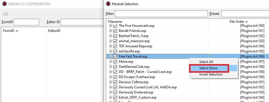 Запускаем  SSEEdit, в открывшимся окне жмём один раз ПКМ и снимаем галочки со всех плагинов