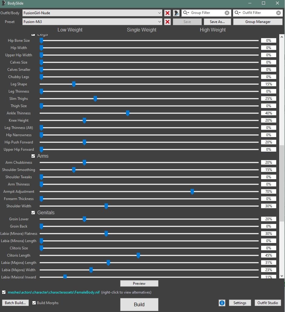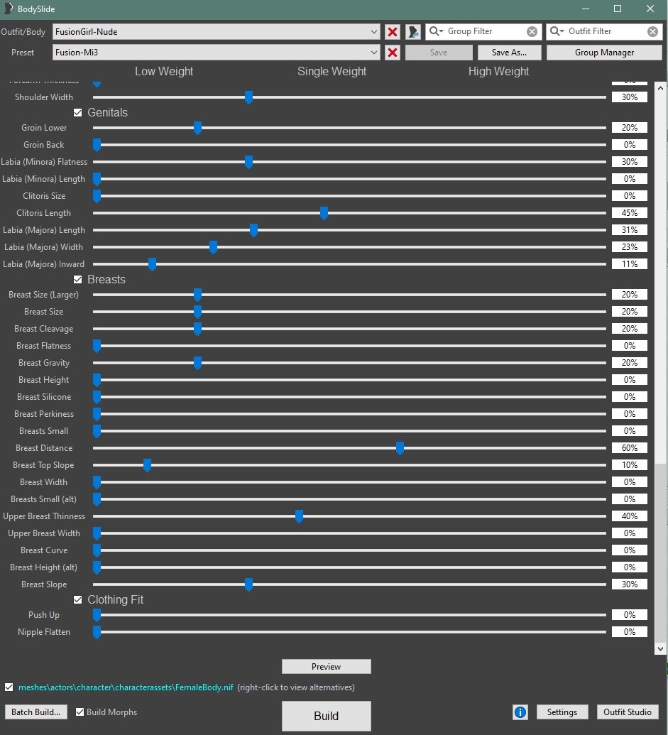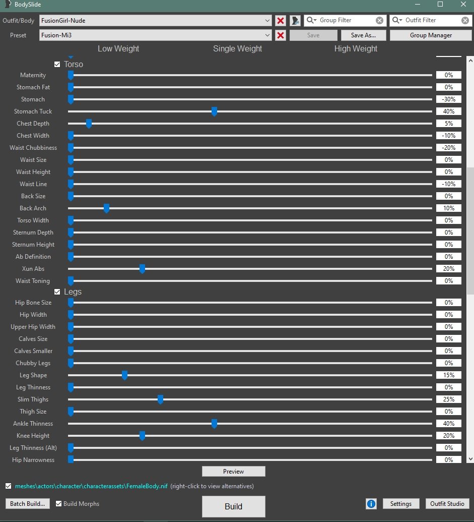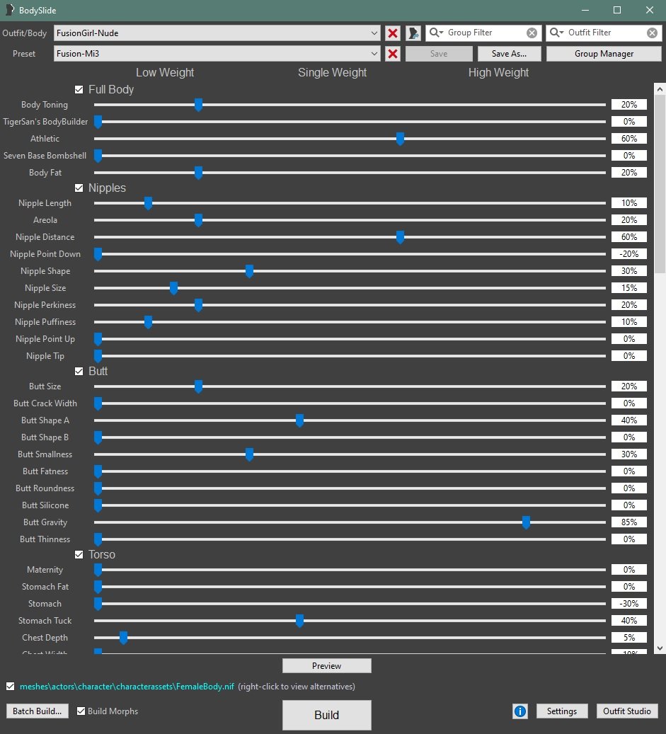 Это последний бодислайд, а дополнительные файлы установила из того, что автор сборки SF8 выложил. Нету раздела отвечающего за живот. Увы...