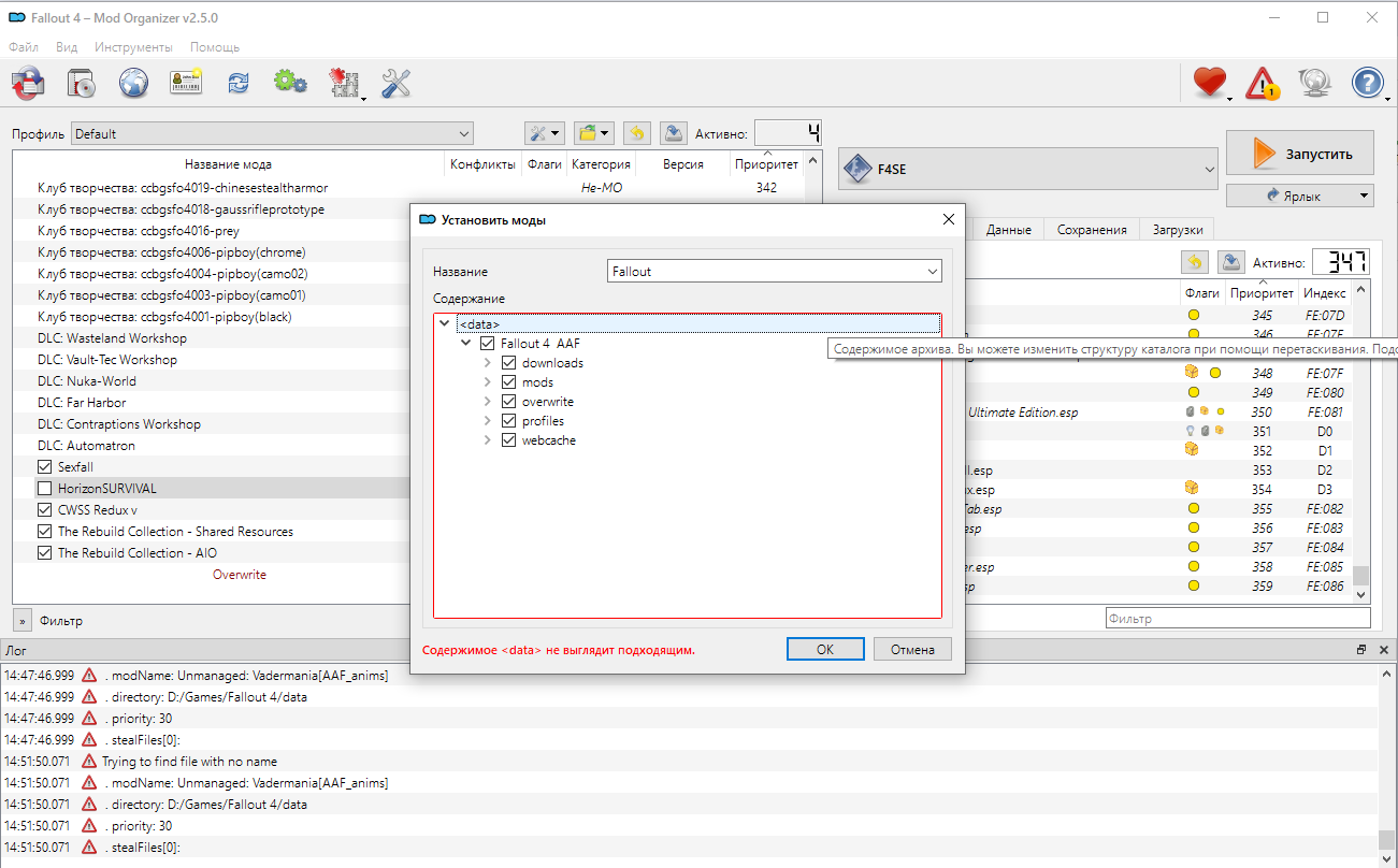 1. Создайте отдельную папку и распакуйте архив. Это будет папка, скажем -  Fallout 4 AAF. Ее содержимое должно выглядеть так