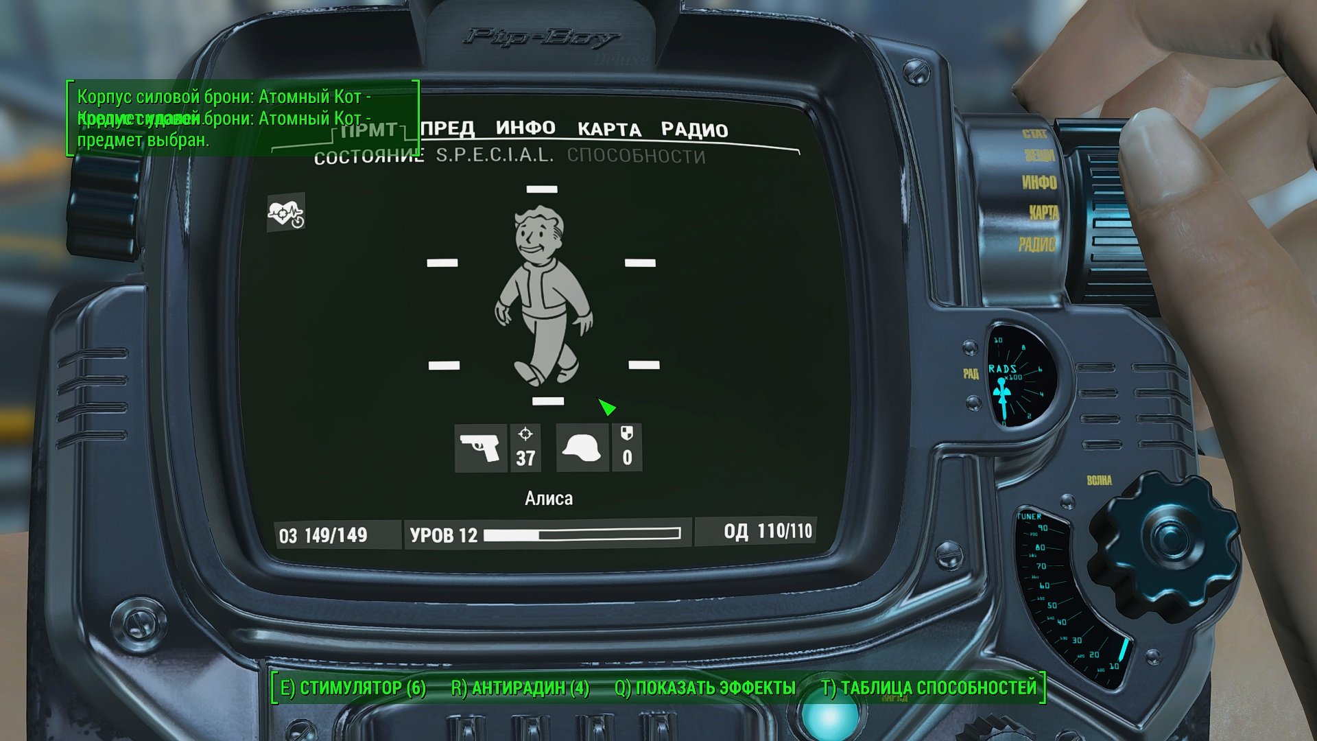 🟢Если у вас пропал пипбой и не отображается при открытии или вместо него голая рука, нажмите клавишу Ё и введите команду: