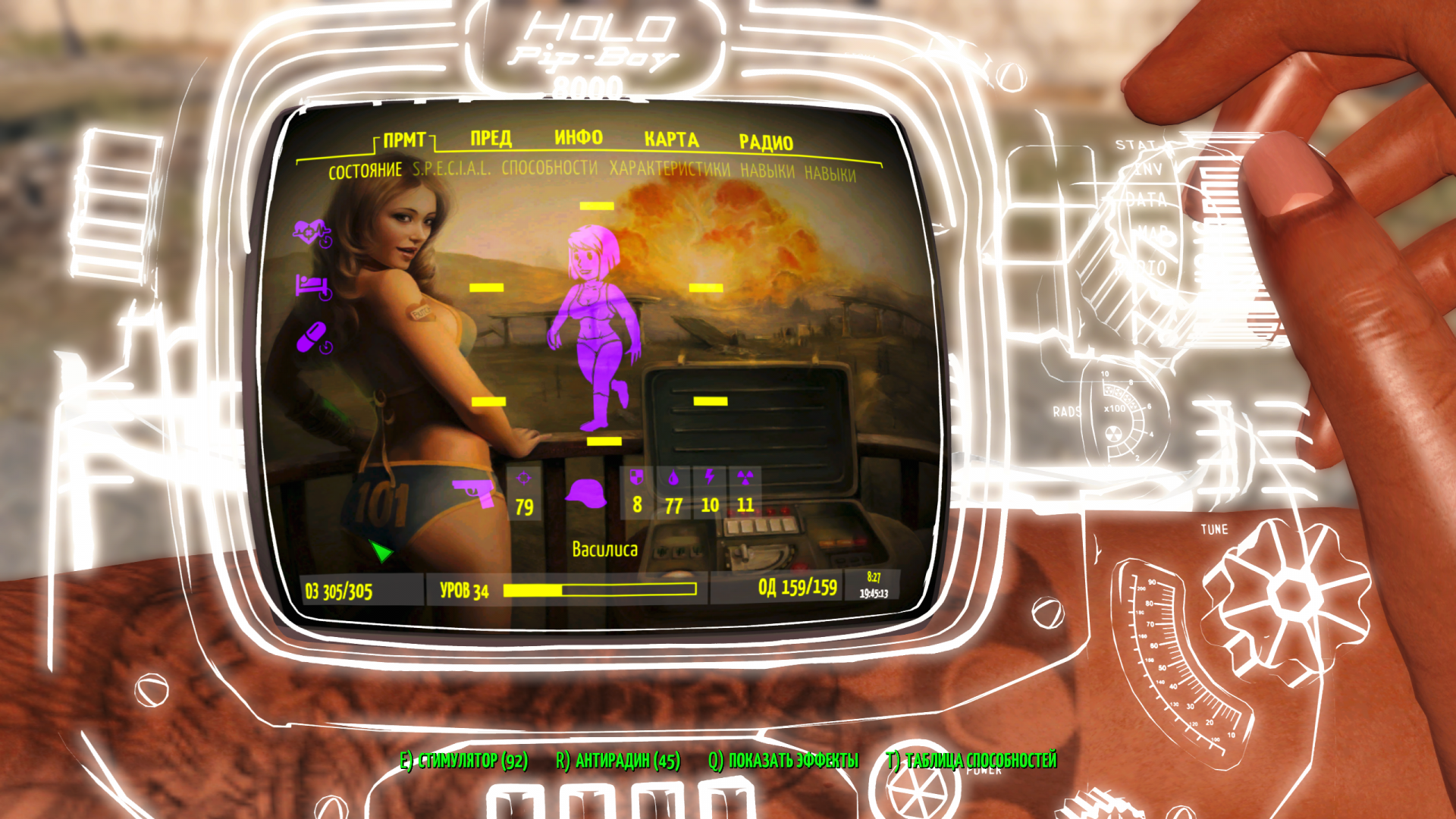 При этом что интересно, это не типичный баг когда пипбой исчез с руки. В типичном случае поднимается рука, она пустая, но видно запястье ГГ. В твоем случае даже руки нету. Мне кажется это вина какого то мода на DD устройства. Поэтому хочу узнать контекст того как пропал пипбой, что именно случилось в промежутке между сейвами?