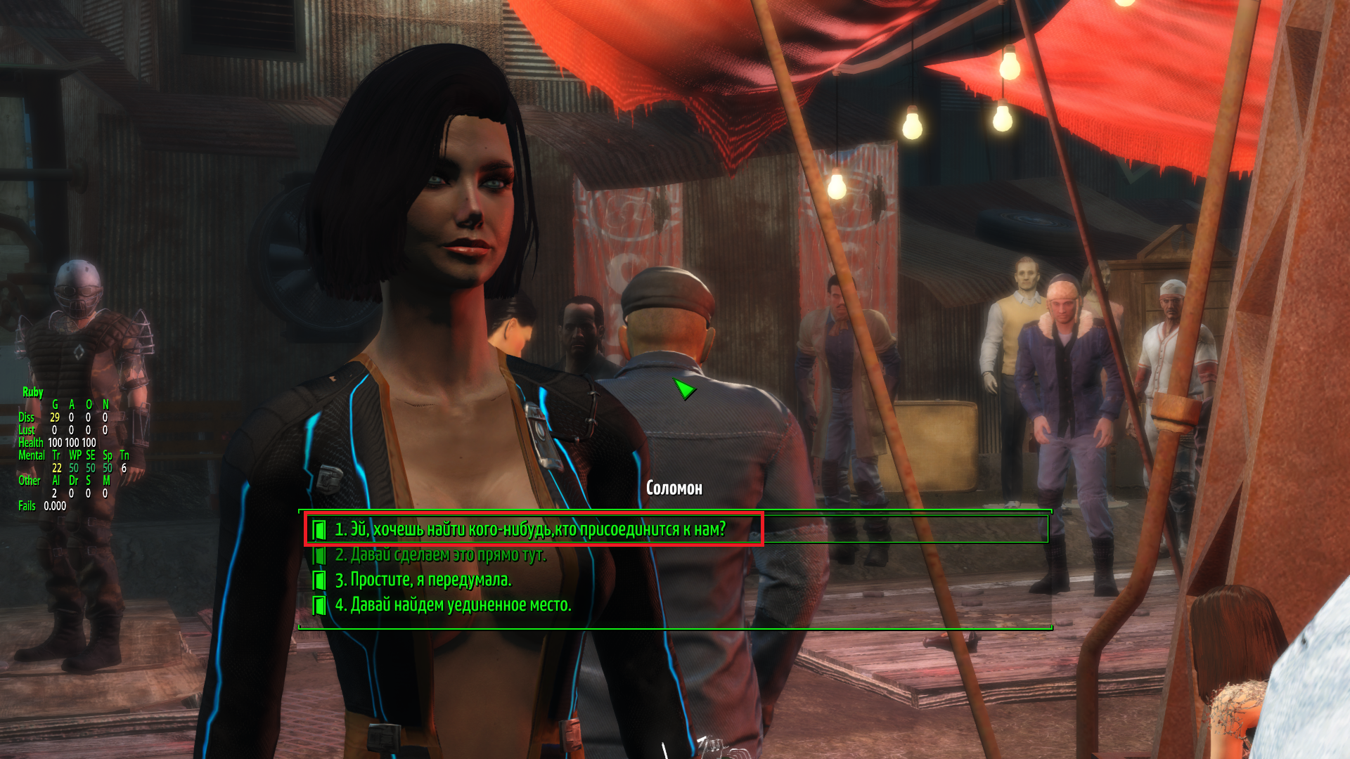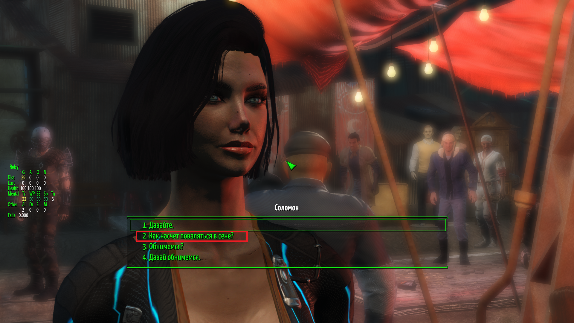 Когда выберешь ту что про групповуху, подойди к любому другому НПС и снова нажми 5. Там прямо подсказка будет от самого мода.