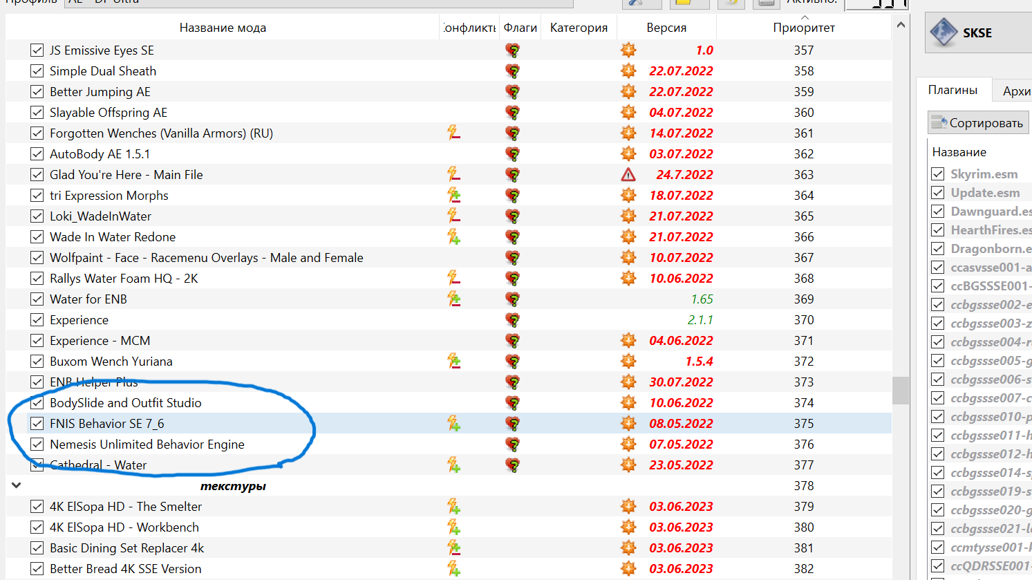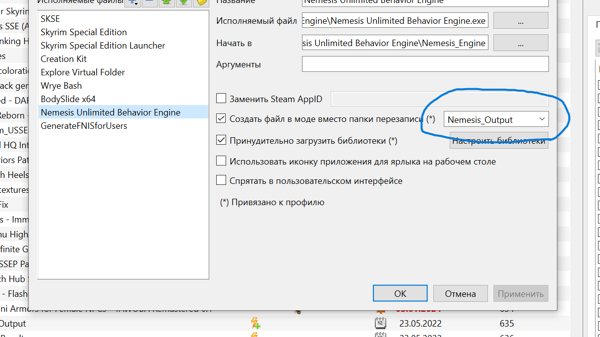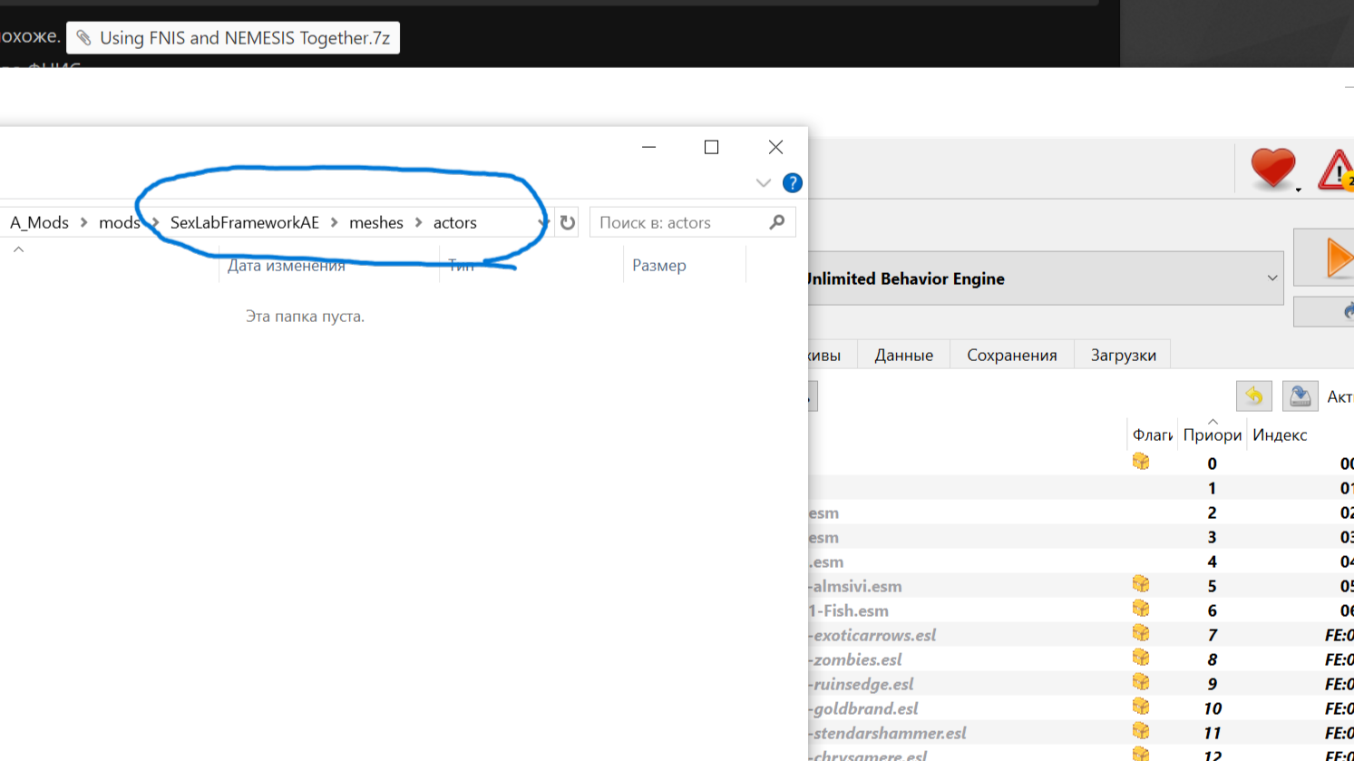 Порядок установки такой-фнис ставим в папку дата напрямую,в мо2 он будет отображаться как неуправляемый мод.Ставим этот же фнис через мо2.Создаем папки вывода для фнис и немезис-вот так