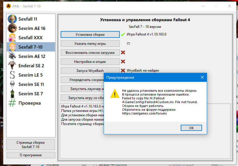 Иногда сборка может вылетать из-за репака, в котором нет ba2-файлов из Creation Club, которые шли в стиме вместе с игрой 1.10.163.