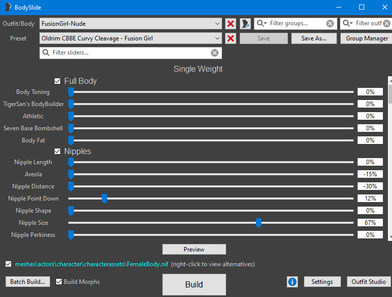Подскажите пожалуйста а как подогнать одежду под нужный персет тела из сборки sexfall 10? дело в том что в самой игре при редактирования тела SLM player я сохранил пресет с одним названием, а в самом bodyslide я вижу чуть ли не 10 разных fusiongirl, какой мне выбрать нужно? как вообще загрузить сохраненный пресет игры в bodyslide?bodyslide.thumb.PNG.f8b07922639a12f5f90b7d7bf9a2649e.PNGpreset.thumb.PNG.94cfcb822cb68bf7526d5b372bc4b942.PNG