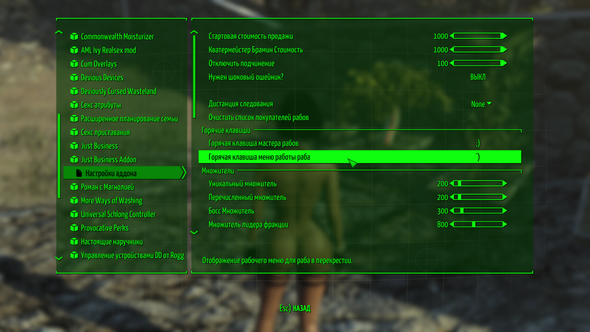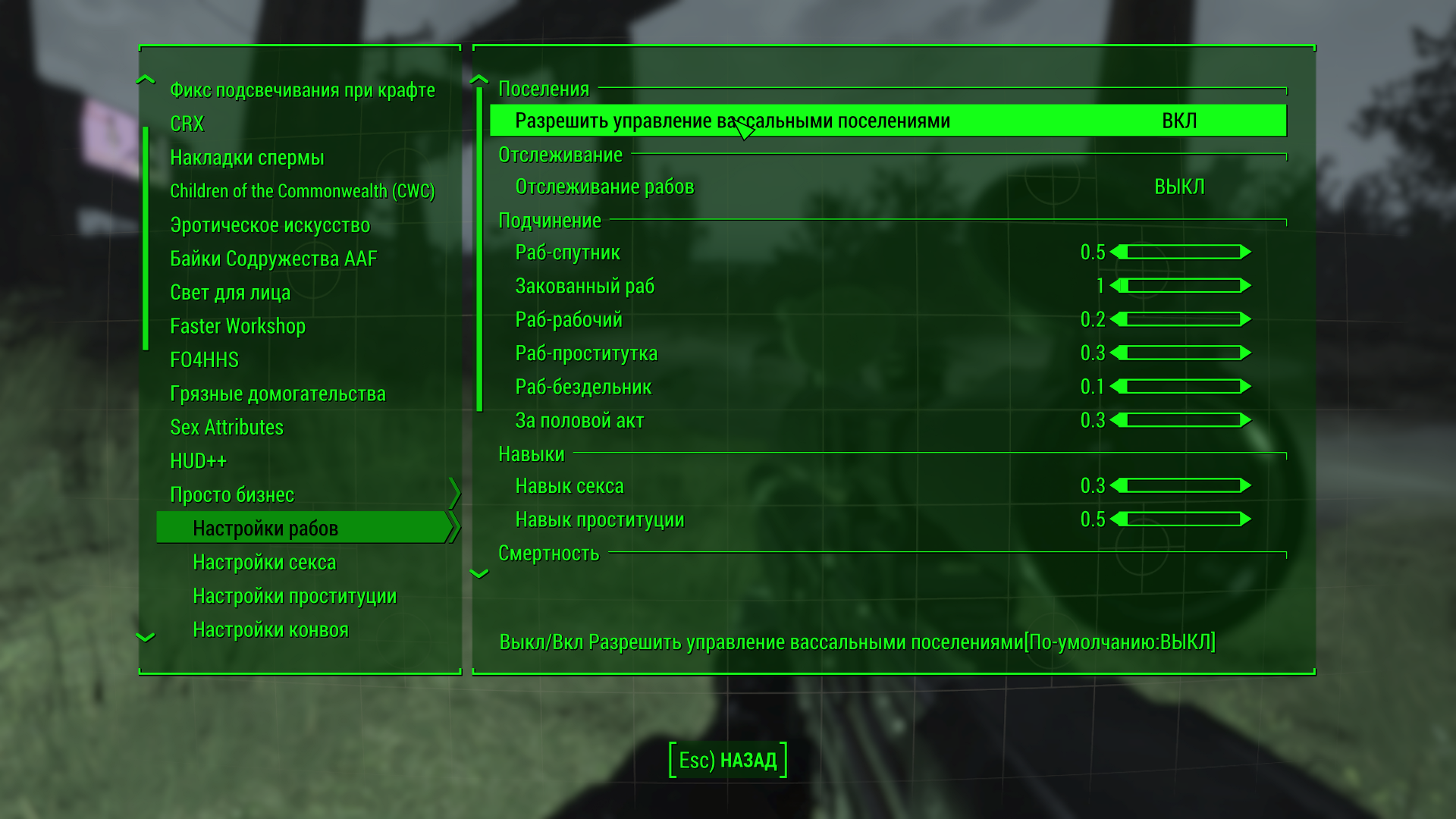 Все настраивается здесь .Если нет диалога нужно немного подождать,можно попинать,пострелять пока не появится диалог.В поселении можно назначить на проституцию или работу на грядках,более продвинутые работы (охрана,торговля) после 100% подчинения.Этот мод не сохраняет настройки мсм при первой загрузке,поэтому нужно настраивать самому