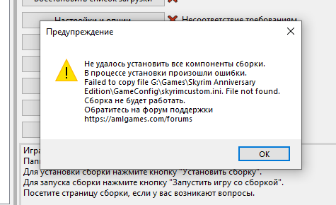 Всем привет. скачал мод и нужную версию игры с дискорд сервера.  и при установке выдает ошибку, мол не видит skyrimcustom.ini и почему-то ищет его в в папке с игрой а не в документах. Перемещал папку с файлом в папку с игрой, ничего не поменялось ошибка также не дает установить мод. хотелось бы знать что делать, и сталкивался ли кто еще с такой проблемой. если знаете что делать дайте знать.