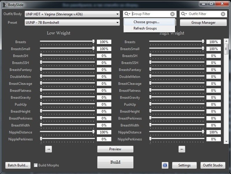 А можешь поподробнее объяснить как вручную сделать? Просто как уже сказал меши лежат в CalienteTools\BodySlide\ShapeData без указания размера. Могу ли я в наглую перетаскивать их в armor и дублировать с припиской размера? Имхо реплейсер там состоит из десятка других+ измененный автором. Так что автоматикой тут и не пахнет. И что касается Choose groups,там не на чем выставлять галки от слова совсем. 3 раздела как и при чистой сборке: CBAdvanced,Unified UNP,Unassigned