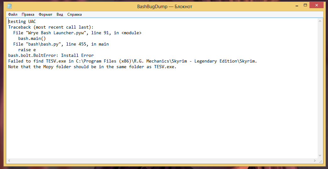 Привет. Попробуй отдельно скачать и переустановить Wrye Bash. И кстати игру лучше всего устанавливать в места попроще - типа D:\Games\Skyrim