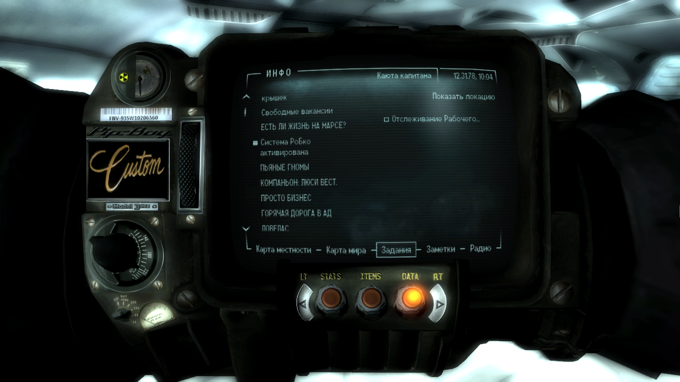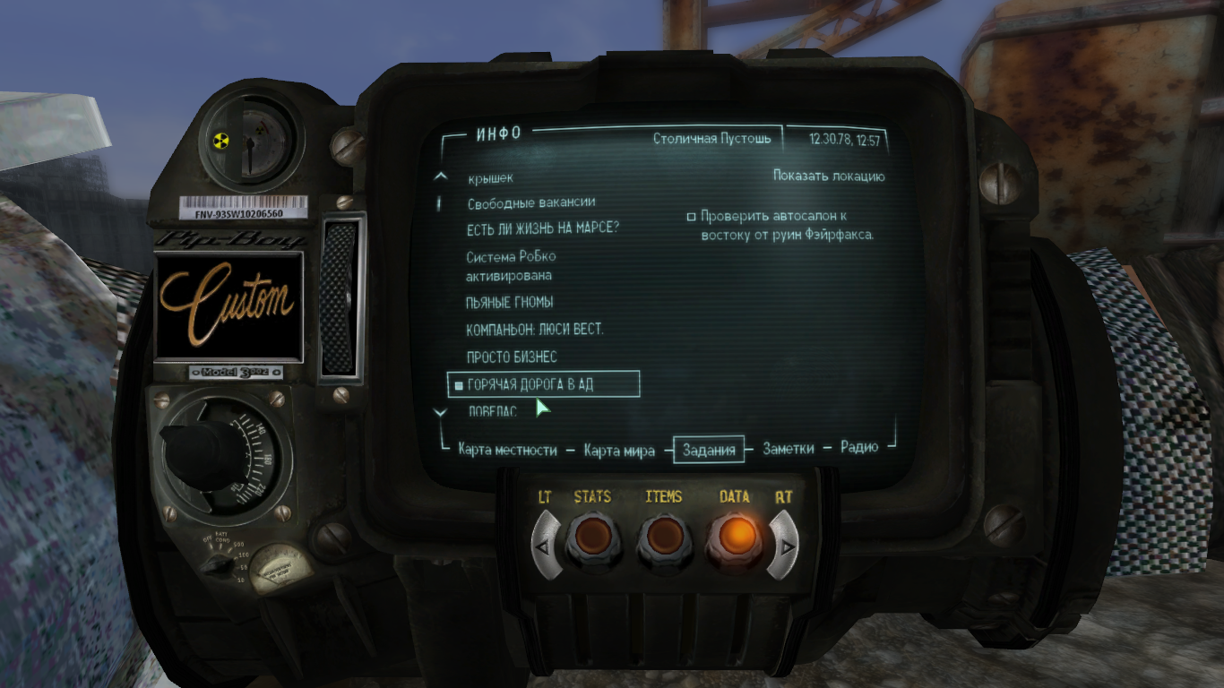 @Torn Ясно,спасибо. А еще пару вопросов: 1) Квест с Люси Вест, починил я оружие в Ривет-сити, задание засчиталось, а что делать дальше, квест висит еще как не завершенный? 2) Квест с работорговлей, я не понимаю куда нужно стрелять дротикометом, чтобы не убить непися, ибо не получается пройти квест этот?