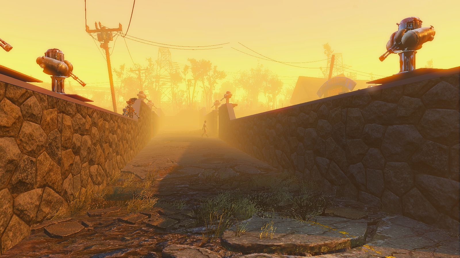 Дорога пересекает поселение ограждённое забором, и усиленное турелями.