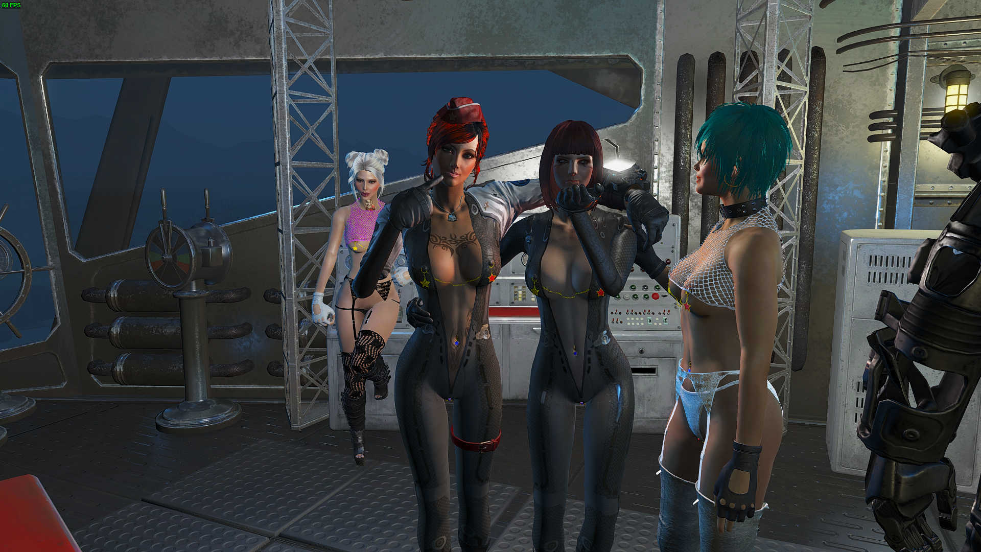 Рокси хлопает по плечу новой спутницы. Слева на право - Валькирия, Алиса, Рыцарь братства стали и Рокси.