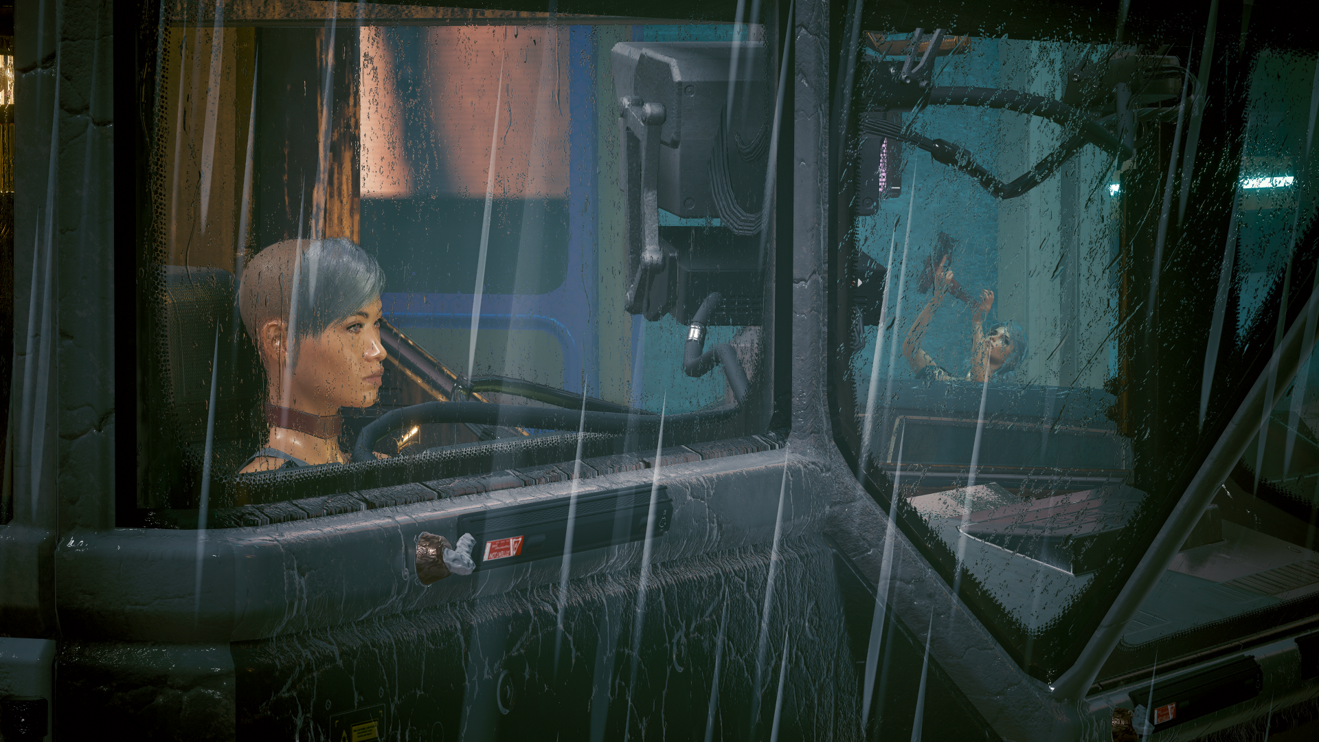 И видно сквозь стёкла как Ви на ходу перезаряжает свой Культовый Эм.П. "Катахула". В прологе - во время перестрелки с мусорщиками в преследующем их пикапе.