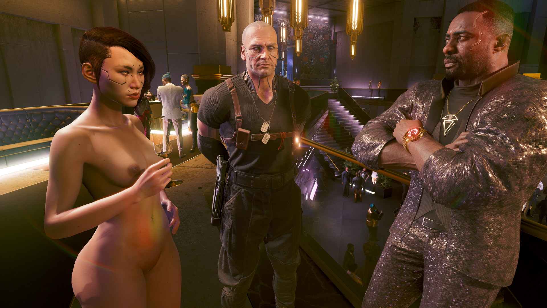 Соми знакомит Курта Хансена с Соломоном Ридом и Ви. На закрытой вечеринке в концерт-холле отеля «Чёрный сапфир» Пёсьего города.
