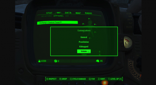 Этот мод добавляет множество опций и настроек ко всем модам Vinfamy. Вы можете настроить пол агрессоров, частоту подходов клиентов в режиме проституции, частоту сканирования и т. д. Все настройки находятся в вашем пипбое, в "Контрольной панели Vinfamy". Violate - содержит множество настроек капитуляции игрока и врагов, пороги здоровья, пол агрессоров и т. д. Kidnapped - содержит множество настроек похищения, различные штрафы в городах и поселках и т. д. Autonomy - содержит настройки частоты сканирования, вероятности гей, лесби и гетеро, разрешение компаньонов и т. д. Vanilla Fudge - множество настроек пола НПС, флирта, награда сексом за выполнение задания и т. д. Prostitution - настройки подхода клиентов к игроку, обмен комментариями между клиентами перед сексом, остановка всех боев в режиме проституции, повторный подход клиентов и т. д. Family Planning - можно настроить шансы на беременность в половом акте, будут ли НПС пользоваться презервативами или таблетками и т. д. Требования Fallout 4 и все DLC Four-Play Violate Four-Play Kidnapped Four-Play Autonomy Four-Play Vanilla Fudge Four-Play Prostitution Four-Play Family Planning Что нового в версии 1.4 1.4 - добавить опцию исключить / включить враждебные фракции в качестве клиентов для публичных домов в FP Prostitution 2.4+ 1.4 - Повышенный приоритет квеста, может помочь людям, у которых есть проблемы с инициализацией. 1.3 - Теперь CP может быть поднят с помощью правой клавиши управления. Он больше не будет занимать ни одного слота. Убрали странное уведомление в конце каждой сексуальной сцены, которую я забыл удалить в 1.2. 1.2 - Добавить два режима выбора: выбрать одежду в инвентаре, чтобы ее нельзя было раздеть во время секса, и специально выбрать индивидуального собеседника, который можно выбрать с помощью модов с четырьмя играми. Добавлены параметры настройки для планирования семьи Предотвратите добавление нескольких копий панели в ваш инвентарь. Установка: Папку Data копируем в основную папку с игрой, соглашаемся на слияние и замену файлов. Подключаем мод в программе врайбаш. Требования: Fallout 4 - 1.10.111 F4SE 0.6.12 (http://f4se.silverlock.org/) Four-Play 0.0.8.2 + Four-Play Community Patch 2.6.1