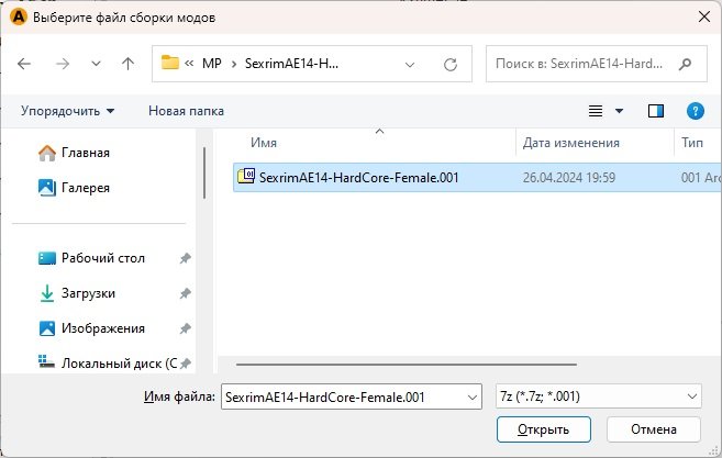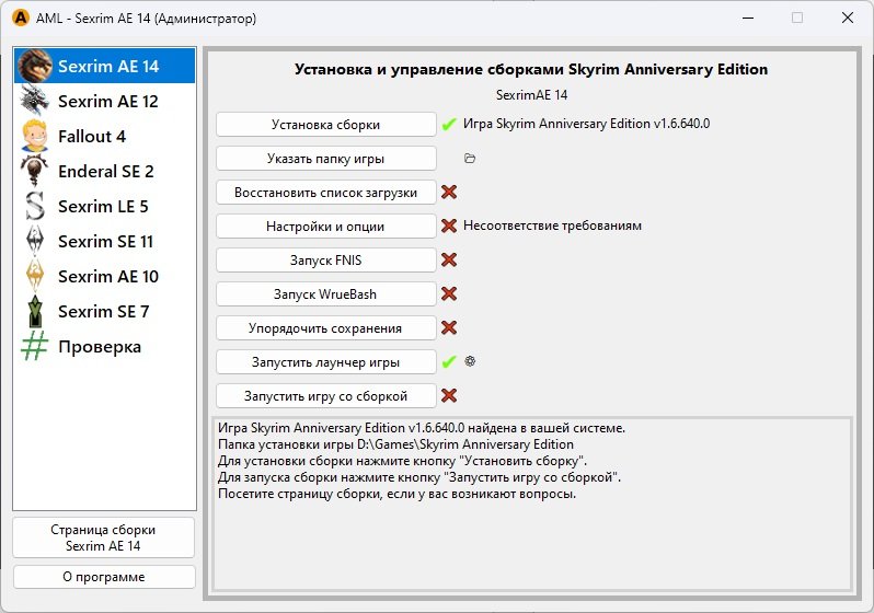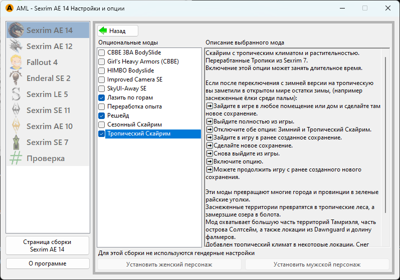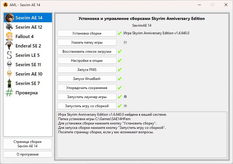 В левой колонке выберите игру Sexrim AE 14. Чтобы установить сборку, нажните кнопку «Установка сборки»