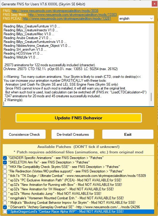 Если в игре возникли проблемы с анимациями, актеры зависают с расставленными руками в Т-позах. Нажмите кнопку «Запуск FNIS». В открывшемся окне должны быть выбраны галочки как на скриншоте ниже. После Нажмите кнопку Update FNIS Behavior и дождитесь когда программа закончит работу.