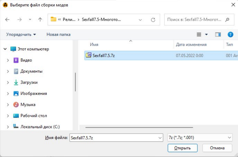 В появившемся окне выберите файл сборки (Sexfall-9* / Sexfall-8FG* / Sexfall7.5)