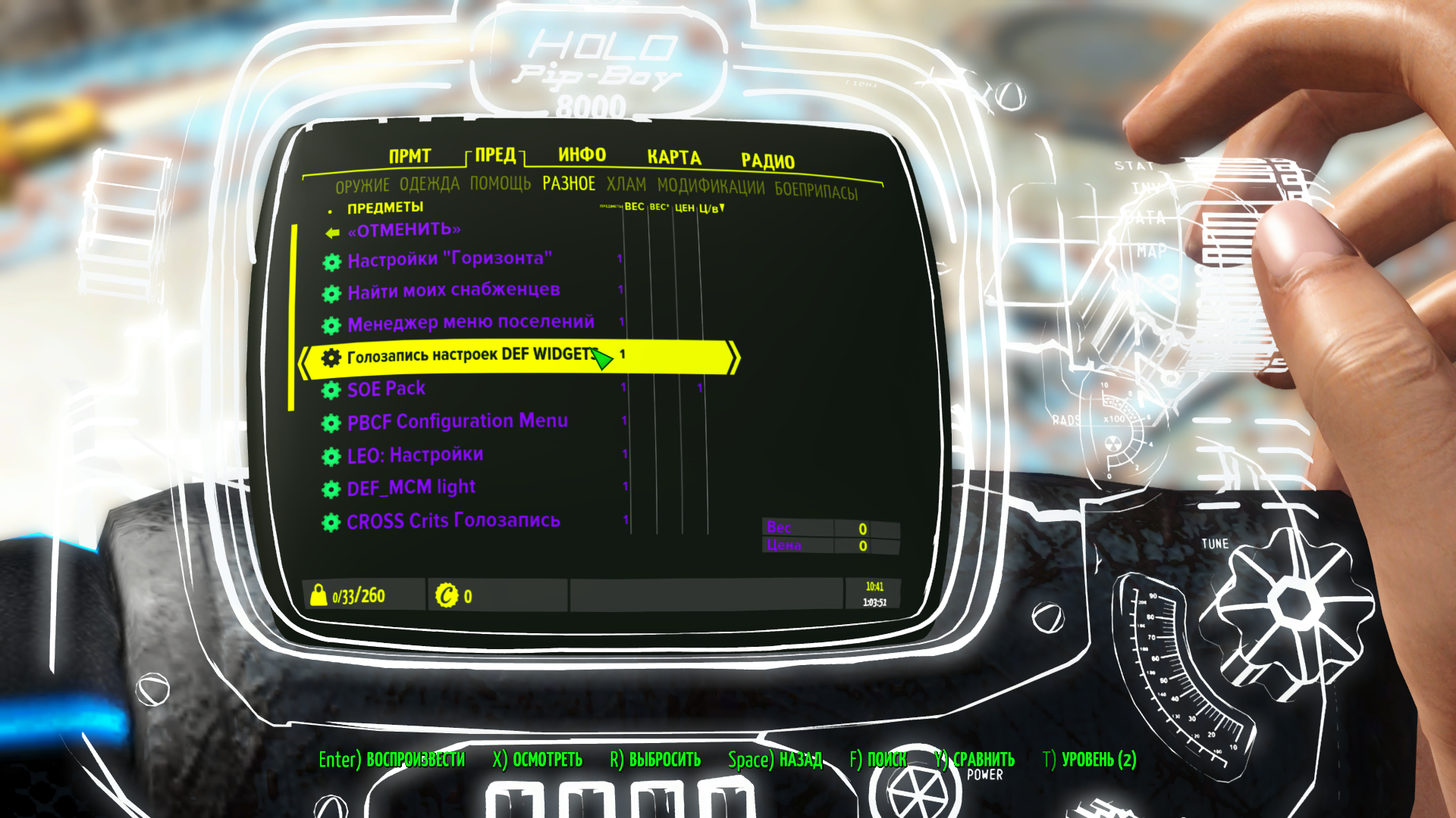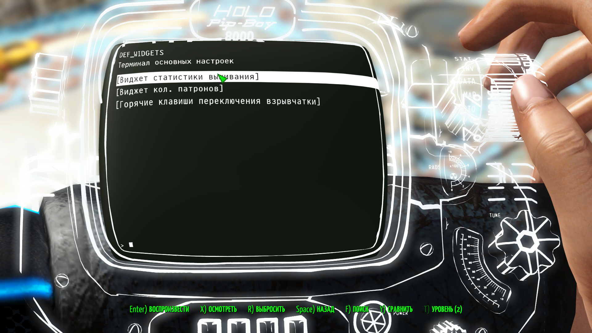 В пипбое можно убрать текстовый виджет мода на выживание AN76 слева на экране. Не убирайте его если собираетесь использовать данный мод.