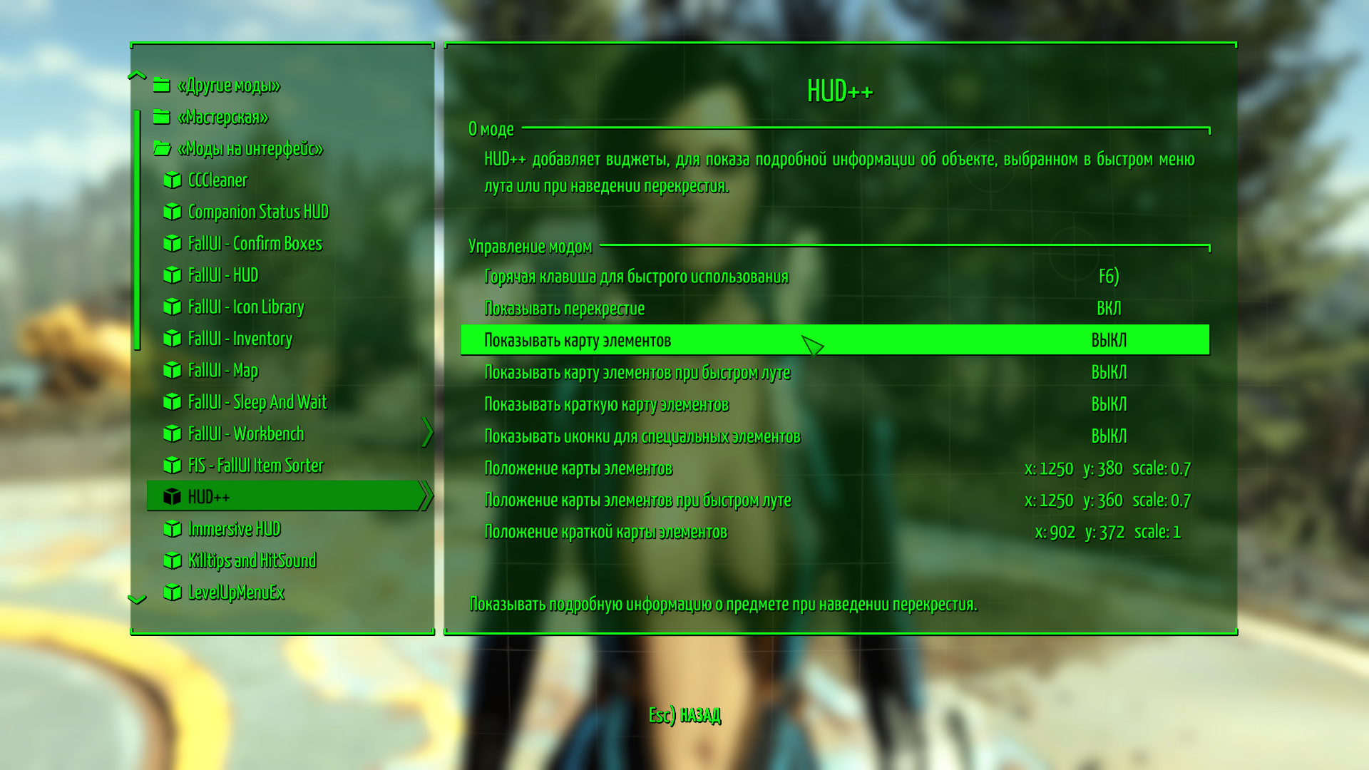 Цель этого меню - дать вам возможность отключить всё, что захочется в моём моде. Обычно для решения проблем, связанных с производительностью, или для ускорения работы мода.