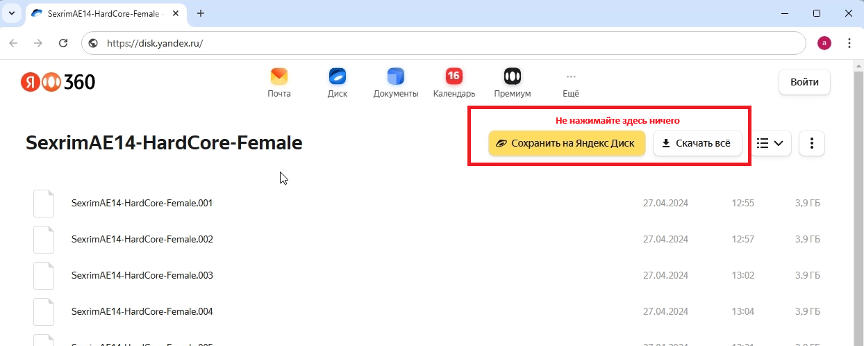 На странице скачивания яндекс диска вы увидите файлы, расположенные в виде списка. Самое главное ни в коем случае не нажимать кнопку "Скачать всё"  и другие элементы вверху над таблицей с файлами.