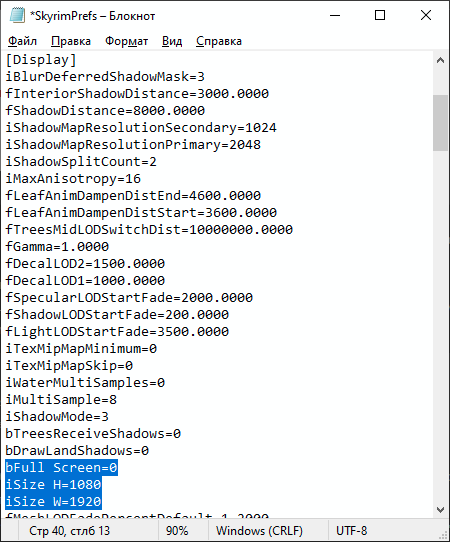 Если строки начинающаяся на iSize в файле отсутствуют, то дописать их после строки [Display]. Отсутствуют они обычно если вы ни разу не запускали ни игру ни лаунчер. После запуска они появляются сами.