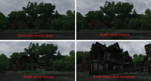 С этим модом вы сможете построить город в Нибенейской долине и управлять им. Жилье Хижины (всего 4) стоят 5000 золотых Дома (всего 3) стоят 15000, цена продажи 12000. Особняки (всего 2) стоят 23000, цена продажи 20000. Магазины Универсам стоимость 10000, цена продажи 7000. Таверна: стоимость 17000, цена продажи 15000. Кузница: стоимость 17000, цена продажи 15000. Часовня Строительство стоит 12000 золотых и ее никто не купит. Но ее строительство привлечет в город много богатых поселенцев, торговцев и жреца. Так как последний зависит от пожертвований, то его «зарплата» будет зависеть от размера его местной общины Стража У стражников есть охраны, где они живут и еженедельно получают жалование. В общей сложности у вас будет 3 стражника: дневной, ночной и лесной (лесник). С ней город получит уважение, а лесник будет приносить дополнительную еду. А если хотите поохотиться, то лесник будет вас сопровождать на охоте Чем больше в городе стражников, тем меньше шансов бандитам грабануть город. Жалобы В сундук ратуши будут добавляться жалобы от местного населения: смерть жителей, в городе закончилась еда и т.д. От количества жалоб будет зависеть, захотят ли богатые поселенцы и торговцы поселиться в вашем городе. Еда Еду городу приносят фермы и запасенные продукты (даже покупные). Но не стоит хранить много еды, иначе бандиты попытаются ее красть. Еду потребляют не только обычные местные жители, но и таверна или универсам (если построены). Еду можно покупать и продавать на рынке Что бы привлечь в город побольше новых поселенцев ваш город должен быть популярным. Но если течение нескольких дней никто не приезжает, то стоит построить что-нибудь новенькое или нанять стражника. Также популярность города зависит и как часто вы его посещаете. Начало Поговорить с Милтоном, который будет бродить по окрестностям. Как только вы инвестируйте в город, то вы станете мэром, а Милтон будет управлять фермой и конюшней. Став мэром, сначала вам нужно отправиться в ратушу и нанять одного из четырех менеджеров. Остальные трое могут позже купить дом или особняк в городе. Требования Oblivion и все DLC-
